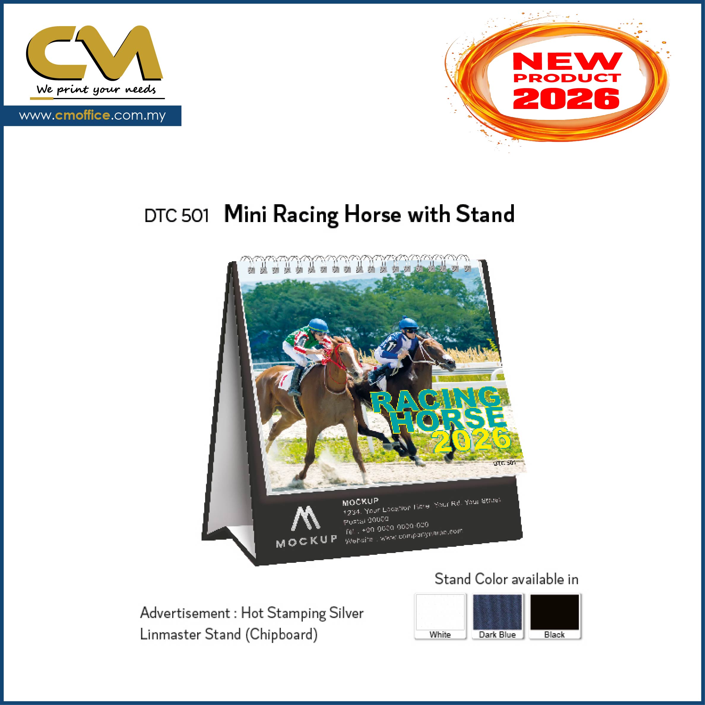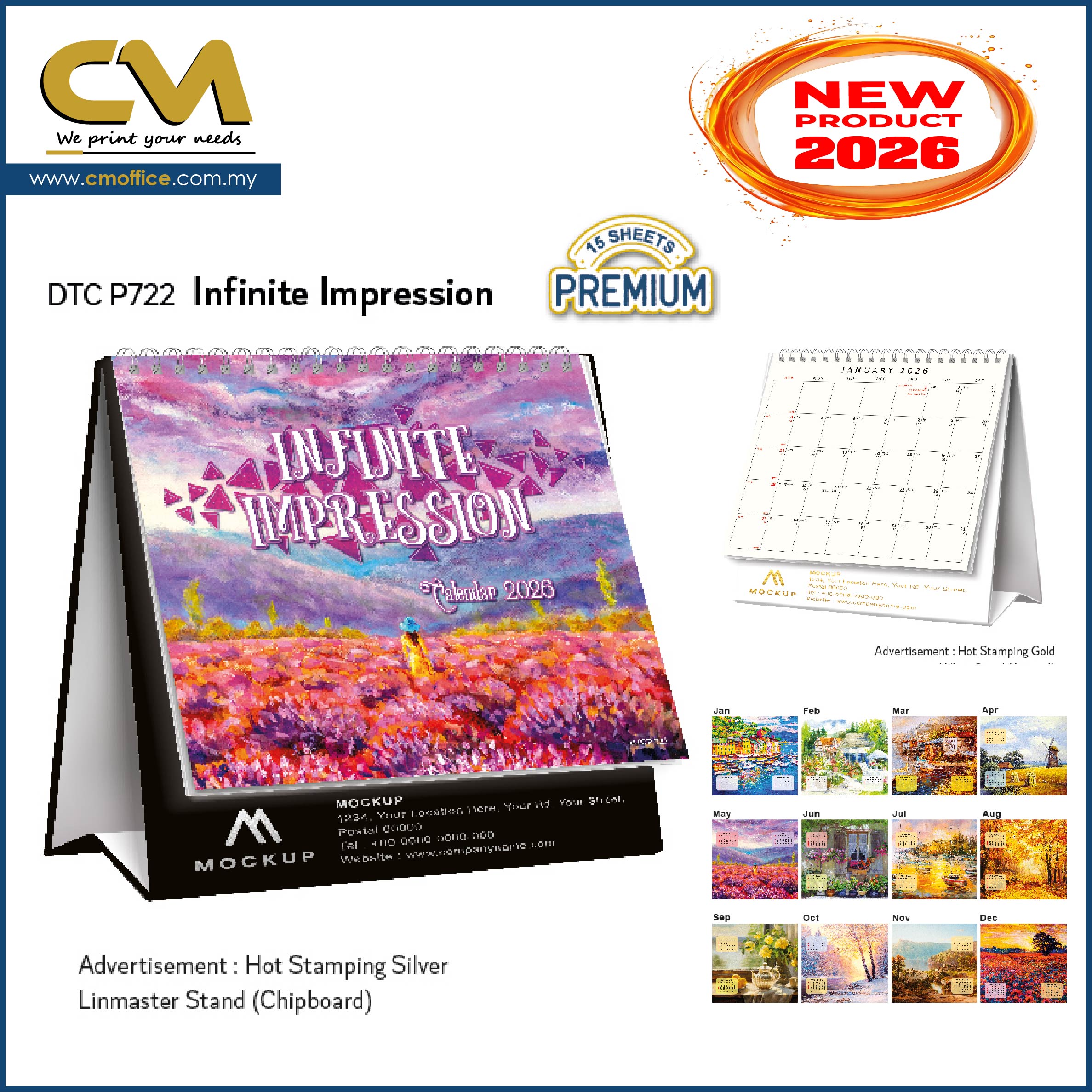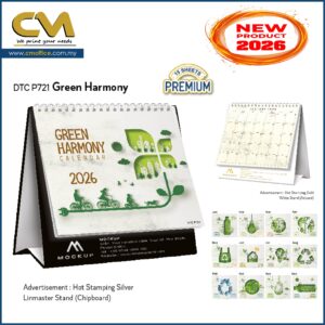 | Descriptions | : | Calendar Size : 133mm x 130mm (5¼” x 5”) Advertisement Space : 25mm x 120mm (1”x 5”) Page : 14 pages (7 Sheets) Stand : Linmaster (700gsm Chipboard), White Stand (400gsm 1 side Art Card) Paper : 210gsm Art Card Calendar Printed in 4c |