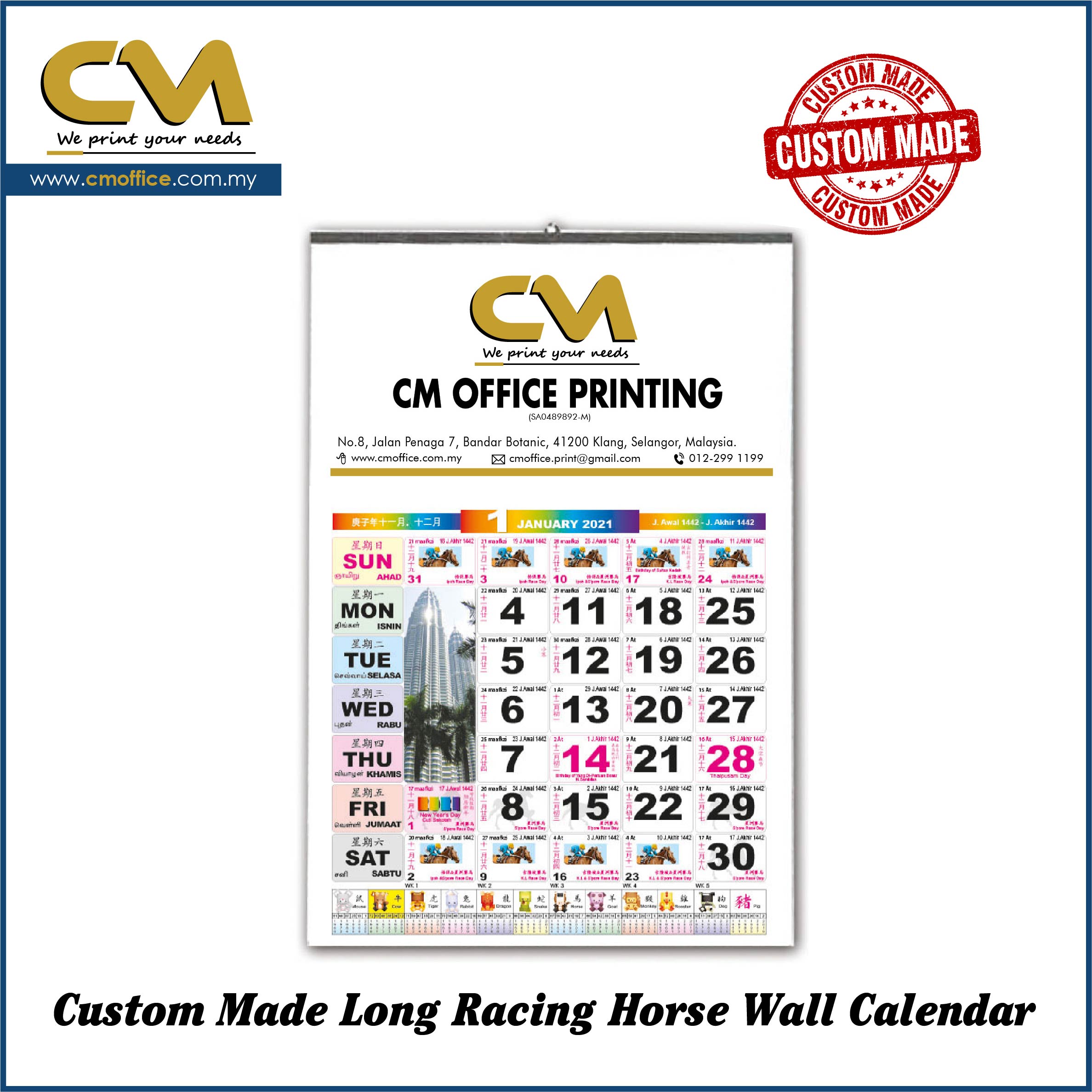 | Descriptions | : | Calendar Size : 265mm x 385mm Advertisement Space : 240mm x 100mm Calendar Header Printed in 1color, 2colors, 4 colors Paper : 60gsm simili white paper |